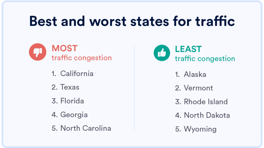 To determine the best and worst states for driving, our insurance editorial team evaluated four key factors: traffic, accidents, theft and extreme weather. Not only do these influence your driving experience, but they can also play a role in determining what you pay for car insurance. Heavy traffic, high accident rates, rampant vehicle theft and extreme weather all make the chances of you filing a claim higher. To make up for this added risk, car insurance rates are usually set a little higher.