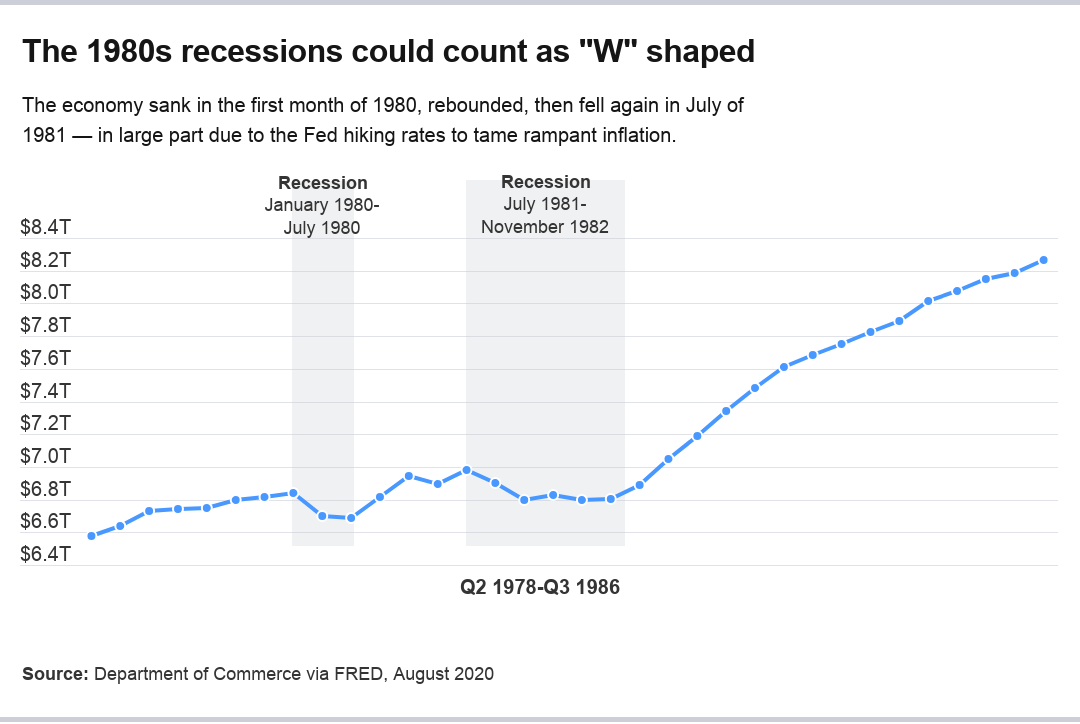 The W-shaped recession isn’t tossed around as much compared with the other alphabetic recession shapes, from the relatively quick snapback “V” downturn to the “U” recession meaning lower for longer. Economists partially chalk that up to being a less-common pattern.