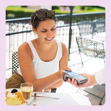 woman holding a credit card and phone in her hands while sitting down with coffee and a glass of water in front of her