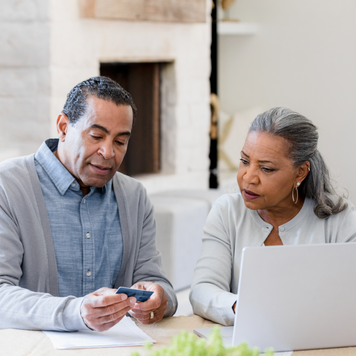 Senior couple sitting at a dining table, using a laptop computer, paperwork and bills on the table