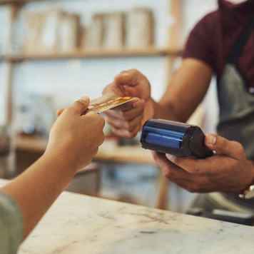 Design element of a person holding a phone in one hand and a credit card in another