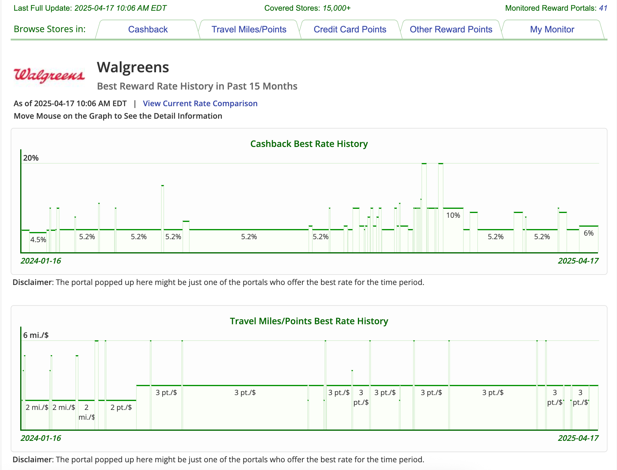 Cashback Monitor has a few other handy tools to help you get more out of the platform. For instance, somewhat similar to rotating category credit cards, many shopping portals vary bonus offers throughout the year. By switching to “View Best Rate History” on the search results page, you can see all the earnings opportunities at a retailer over the previous 15 months: