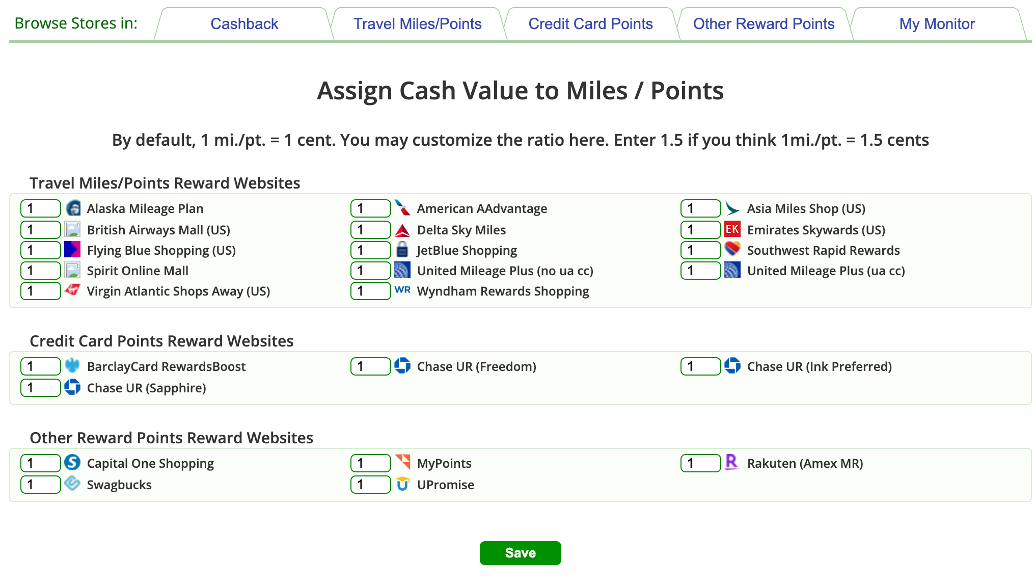 Another helpful feature is the ability to assign a cash value to any reward currency. You’ll have to create a Cashback Monitor account in order to assign points values, but doing so means you can specify the shopping portals and stores you’re most interested in.