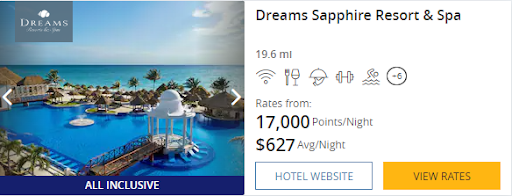 Nightly rates at the Dreams Sapphire Resort and Spa with double occupancy even go as low as 17,000 points.