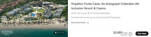 However, you’ll need to fork over more points for free nights with Marriott Bonvoy than you would with Hyatt. As an example, you can book an award night at the Royalton Punta Cana resort for as little as 55,000 points with double occupancy.