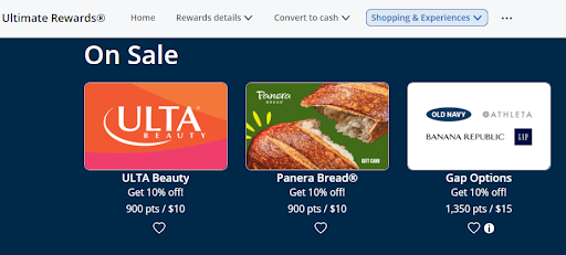 Even better, some rewards programs offer periodic gift card sales — allowing you to secure gift cards for less. For example, during my search, I found ULTA Beauty gift cards available for 10 percent off through Chase Ultimate Rewards. That means your 100,000 Chase points could potentially be worth $1,100 toward gift cards at your favorite retailers.