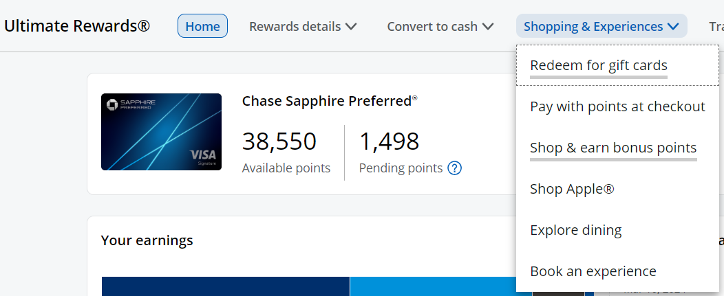 - Navigate to the “Shopping & Experiences” tab at the top of the screen. From there, you’ll click on the “Shop & earn bonus points” option.