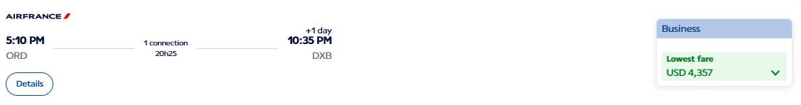 Maybe you need to fly from Chicago, Illinois to Dubai, United Arab Emirates this fall and you desperately want to fly in Business class with a lie-flat seat. In that case, it may be possible to find business class fares for as low as 120,000 miles plus $371.10 in airline taxes and fees.
