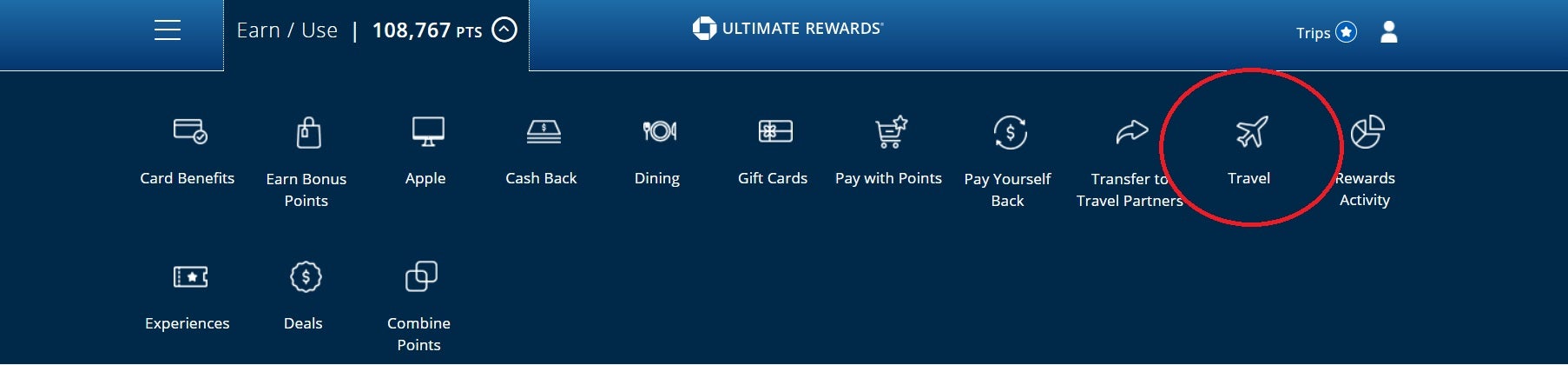 To book travel through Chase Travel, you’ll click on the option that says “Travel.”