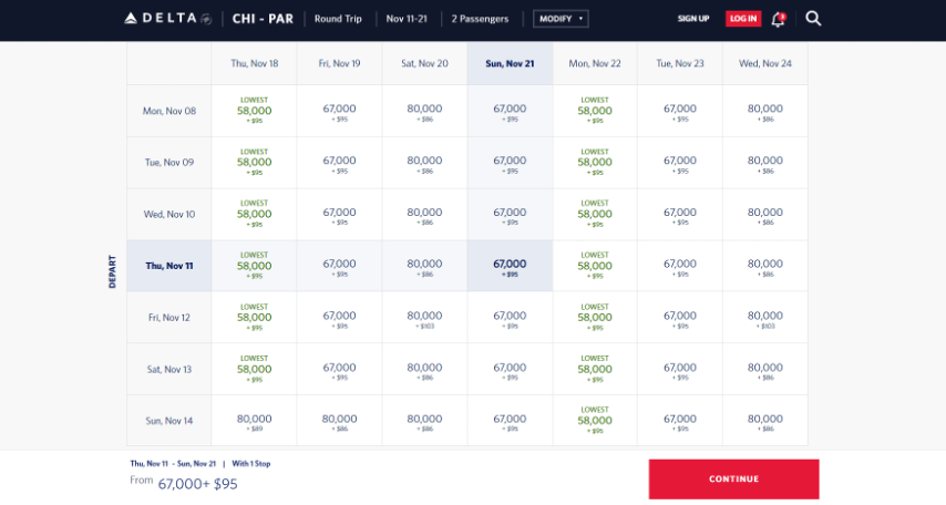• 15% off when using miles to book Delta flights through delta.com and the Fly Delta app (not applicable to partner-operated flights or to taxes and fees)
