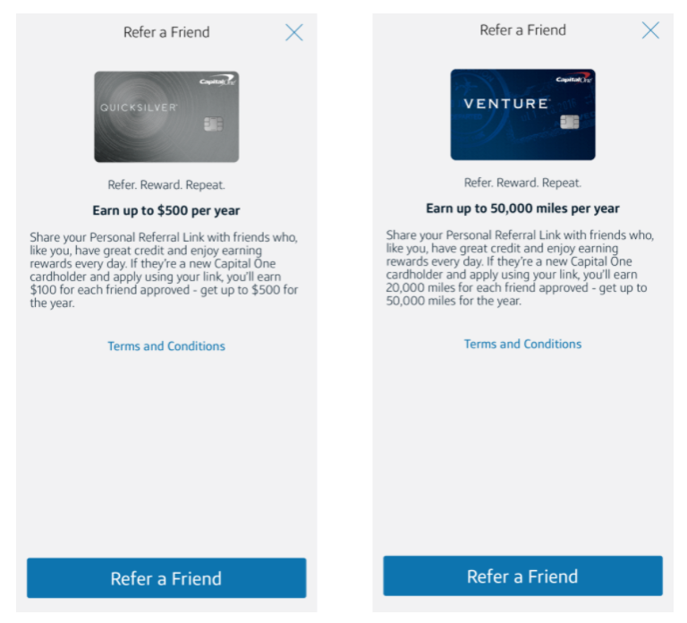 Capital One Capital One provides you with a customized referral link to send to family and friends. They must be new Capital One cardholders who apply and are accepted in order for you to get the bonus. Referral bonus caps differ by card. For instance, you can earn a referral bonus up to $150 for each friend you refer to the Capital One Savor Cash Rewards Credit Card (up to a maximum of $500).