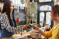 white man handing card to pay