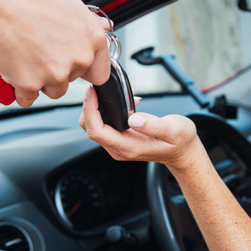 An image of a car key and fob placed over a stack of $100 USD bills. Surrounding it is a light green circle over a dark green background.