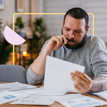 Black man and woman reviewing papers in their living room with a yellow square border and thin yellow circle behind them
