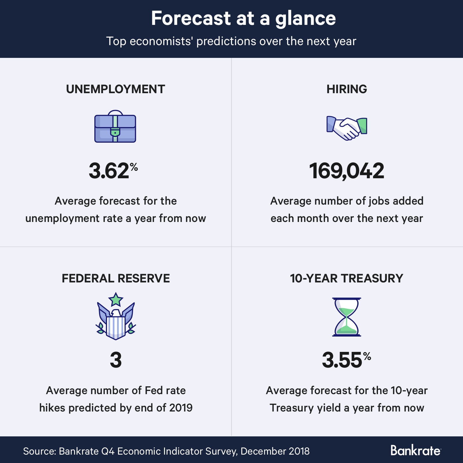 The Fourth-Quarter 2018 Bankrate Economic Indicator Survey of economists was conducted Dec. 13-20. Survey requests were emailed to economists nationwide, and responses were submitted voluntarily online. Responding were: Scott Brown, chief economist, Raymond James; Joseph Brusuelas, chief economist, RSM US LLP; Gregory Daco, chief U.S. economist, Oxford Economics; Robert Dietz, chief economist, National Association of Home Builders; Bill Dunkelberg, chief economist, NFIB; Mike Fratantoni, chief economist, Mortgage Bankers Association; Robert Frick, corporate economist, Navy Federal Credit Union; Robert Hughes, senior research fellow, American Institute for Economic Research; Daniil Manaenkov, chief U.S. economist, RSQE, University of Michigan; Bernard Markstein, president and chief economist, Markstein Advisors; Chad Moutray, chief economist, National Association of Manufacturers; Joel L. Naroff, president, Naroff Economic Advisors; Jim O’Sullivan, chief economist, High Frequency Economics; Satyam Panday, senior economist, S&P Global; Lindsey Piegza, Ph.D., chief economist, managing director, Stifel Nicolaus & Co.; Lynn Reaser, chief economist, Point Loma Nazarene University; John E Silvia, president, Dynamic Economic Strategy; Sean Snaith, director, Institute for Economic Competitiveness – College of Business Administration, University of Central Florida; William E. Spriggs, chief economist AFL-CIO; Phillip Swagel, professor, University of Maryland School of Public Policy; Ryan Sweet, director of real-time economics Moody’s Analytics; Diane Swonk, chief economist, Grant Thornton; Scott Wren, senior global equity strategist, Wells Fargo Investment Institute; Lawrence Yun, chief economist, National Association of REALTORS(r).