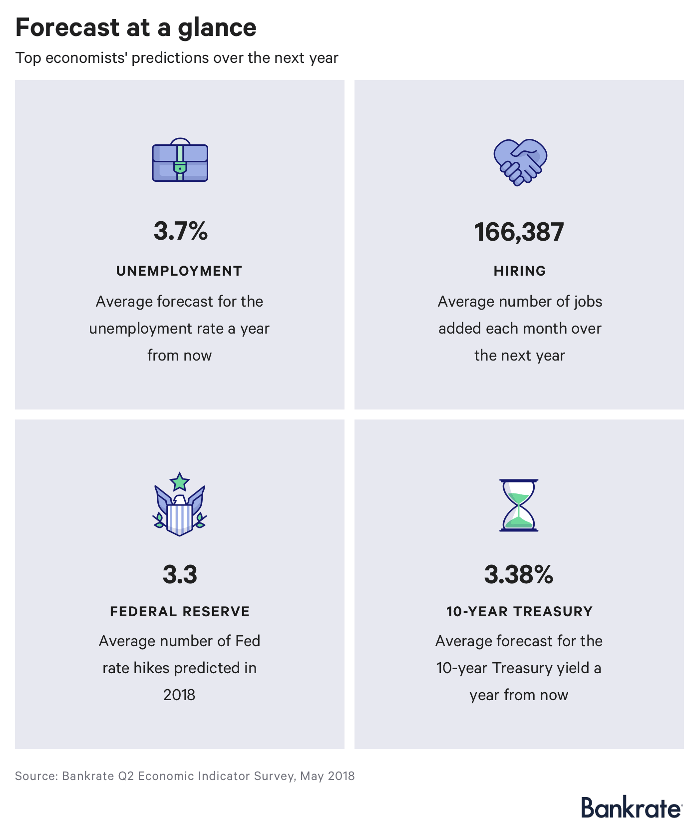 Experts say the economic outlook is bright, at least in the short term, according to Bankrate’s Second-Quarter Economic Indicator survey of 18 top economists. Additional job growth is expected and the unemployment rate is predicted to keep falling.